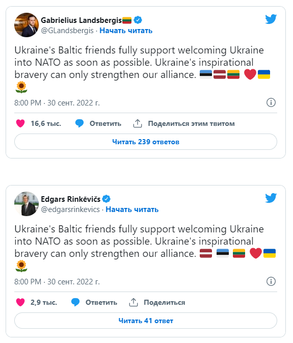 ![]() Фото: из открытых источников Главы МИД Литвы, Латвии и Эстонии опубликовали в своих блогах Twitter сообщения с одинаковым текстом в поддержку скорейшего вступления Украины в НАТО.