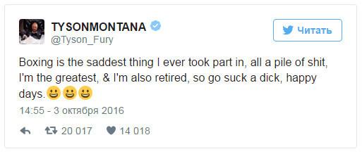![]() Тайсон Фьюри Британец в своем Twitter написал о том, что завершает карьеру