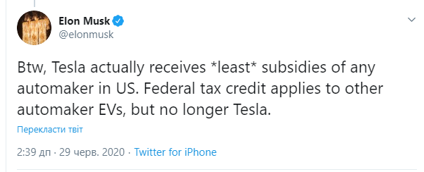![]() Фото: из открытых источников Илон Маск написал в Twitter, что Tesla уже не получает налоговые субсидии