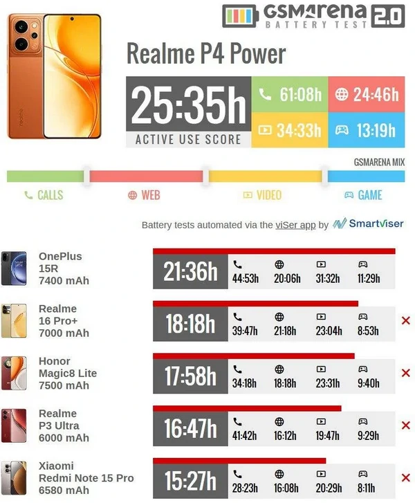 В январе компания Realme вывела на рынок смартфон P4 Power c рекордной кремний-углеродной батареей 10 001 мАч. Устройство уже протестировали на время автономной работы – и оно ожидаемо оказалось рекордным. В испытании GSMArena, который имитирует усредненный режим использования, смартфон продержался 25 часов и 35 минут. Это более чем на 2.5 часа дольше, если сравнивать с предыдущим рекордсменом OnePlus 15. В обзоре упоминается, что в режиме разговора Realme P4 Power выдерживает 61 часов и 8 минут, при просмотре видео – 34 часа и 33 минуты, скроллинг соцсетей – 24 часа и 46 минуты. Если играть в мобильные игры, то заряда батареи хватит на почти 14 часов. Что касается конкурентов в своем ценовом сегменте, то их Realme P4 Power буквально "уничтожил". OnePlus15R уступил почти на 4 часа, выдержав 21 час часов и 36 минут. Honor Magic 8 Lite проработал 17 часов и 58 минут, а Xiaomi Redmi Note 15 Pro отстал почти на 10 часов. Итого: если следовать результатам тестов, можно реально ожидать 30–50% более длинное время работы аккумулятора по сравнению с традиционными смартфонами на 5000-6000 мАч. Впрочем, не обошлось и без нюансов. Так, батареи больших размеров дольше заряжаются при тех же показателях мощности зарядки. Например, OnePlus 15R заряжается до 100% за 53 минуты, тогда как у Realme P4 Power для полной зарядки потребуется примерно 79 минут. Ожидается, что в 2026 году смартфоны с батареей 10 000 мАч станут обыденностью. В первую очередь это будет относиться к моделям среднего класса от китайских производителей. Меж тем некоторые из самых популярных флагманских устройств едва преодолевают отметку в 5000 мАч. Например, у Galaxy S25 Ultra аккумулятор емкостью ровно 5000 мАч. И, как указывают утечки, он сохранится и в Galaxy S26 Ultra. | |