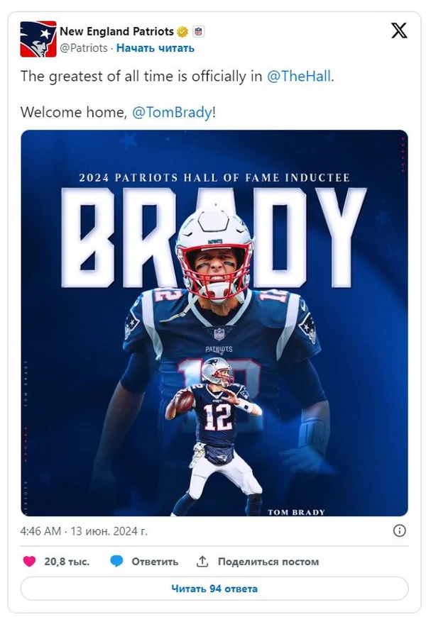 Награда нашла своего героя. Накануне произошло важное событие в мире американского футбола. Нью-Ингленд Пэтриотс провели церемонию введения в Зал славы клуба величайшего игрока в истории НФЛ Тома Брэди. На мероприятие, которое длилось три часа, пришло немало болельщиков и знаменитостей, включая более 200 бывших одноклубников Брэди. Владелец Пэтриотс Роберт Крафт объявил во время церемонии, что ни один игрок в истории франшизы не сможет выступать под 12-м номером, который навсегда будет закреплен за семикратным победителем Супербоула. Брэди надел красный пиджак члена Зала славы и выступил с речью.