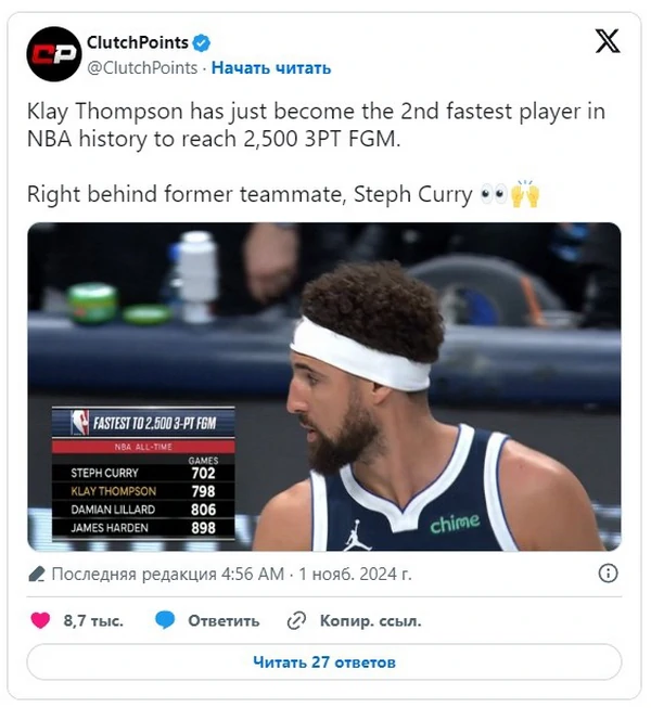 Томпсон — второй «самый быстрый» игрок, забросивший 2500 трехочковых | |