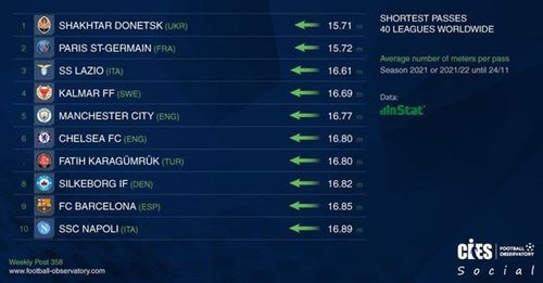 Донецкий Шахтер отдает самые короткие передачи среди всех европейских клубов - подсчитали в футбольной обсерватории CIES."Горняки" и ранее не отличались особой любовью к вертикальному футболу, но при новом наставнике - итальянце Роберто Де Дзерби, полностью перешли на короткий пас. И на данный момент опережают по этому показателю все команды "Старого Света". Эксперты подсчитали - средняя дистанция, которую проходит мяч после паса игрока Шахтера, меньше, чем у ПСЖ, Лацио и Манчестер Сити. Ну, а самыми длинными передачами в Европе, традиционно, пользуются на "Туманном Альбионе". После пасов английских и шотландских команд круглый пролетает в среднем 23-24 метра. | |