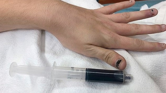 У жительницы США посинела кровь после приема обезболивающего препарата. Об этом сообщает Daily Mail.Женщина перед сном выпила большую дозу обезболивающих, которые содержат в себе вещество бензокаин. Когда вместо прекращения боли, американка почувствовала слабость и недомогание, она обратилась в больницу. Там медики первым делом взяли у женщины образцы крови и увидели, что она темно-синего цвета. Ногти пациентки и участки кожи также имели такой же оттенок. Оказалось, что из-за передозировки бензокаина у женщины развилась метгемоглобинемия. При этой болезни в крови увеличивается процент метгемоглобина, который и придает крови и коже синий цвет. ![]()