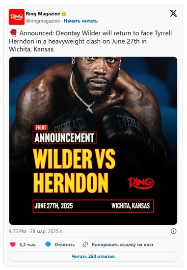 Бывший чемпион мира по версии WBC в супертяжелом весе Деонтей Уайлдер (43-4-1, 42 КО) получил нового соперника на свой ближайший бой. Изначально американский боксер должен был вернуться в ринг в апреле, встретившись с соотечественником Кертисом Харпером, однако этот поединок сорвался. Теперь же стало известно, что 39-летний Уайлдер после годичного простоя подерется с еще одним американцем 37-летним Тайрреллом Херндоном (24-5, 15 КО). Как сообщает The Ring, десятираундовый поединок состоится 27 июня в городе Уичито, штат Канзас, США. Уайлдер проиграл четыре из пяти своих последних боев. Дважды уступив Тайсону Фьюри, "Бронзовый бомбардировщик" вернулся победой над Робертом Хелениусом, но после потерпел поражения от Джозефа Паркера и Чжана Чжилея. В послужном списке Херндона нет значимых имен, но сейчас американский боксер идет на серии из трех подряд побед, последнюю из которых одержал в мае прошлого года. | |