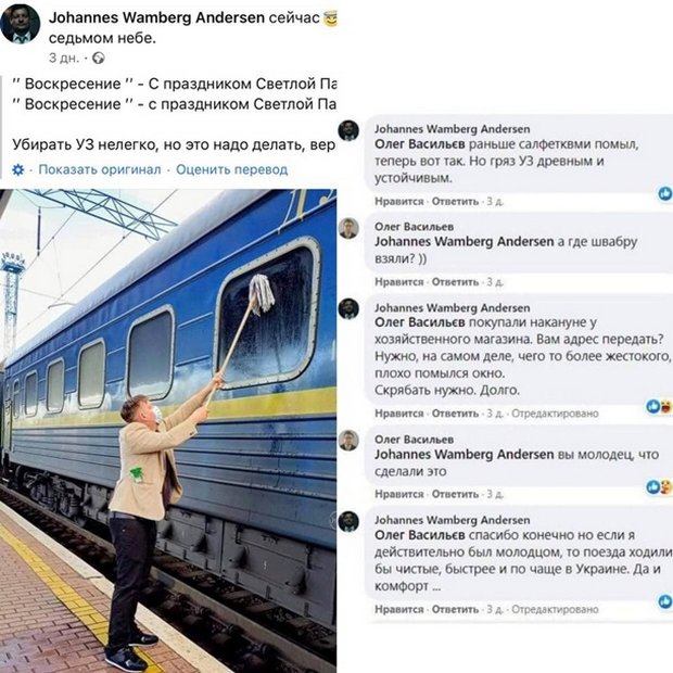 ![]() Фото: Facebook/Johannes Wamberg Andersen Датчанин, находясь в поезде Укрзализныци, не выдержал и на остановке с помощью швабры вымыл грязное окно.