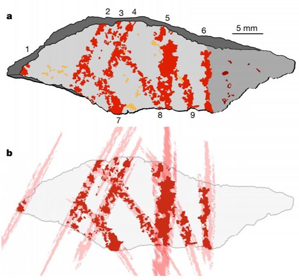 ![]() Фото: nature.com На данный момент это самый древний рукотворный рисунок, найденный на планете. Образец был обнаружен в ЮАР.