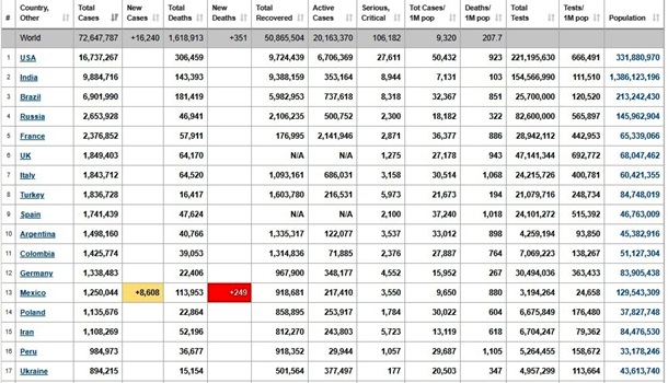 Украина, по состоянию на 14 декабря, находится на 17 месте в мире по скорости распространения коронавируса. В стране заболело COVID-19 894 215 человек, согласно данным статистического сайта Worldometer.Так, на сегодня в мире выявлено более 537 тысяч новых случаев инфицирования коронавирусом. За последние сутки из-за COVID-19 умерло 7 582 человека. Лидером по количеству новых COVID-случаев являются США, Индия, Бразилия, Россия и Франция. Сейчас в мире диагностировано 72 миллиона случаев инфицирования коронавирусом, 50 миллионов больных вылечились, 1 610 173 COVID-пациентов умерли. | |