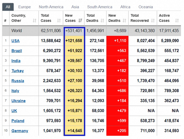 Украина вошла в первую десятку стран мира и тройку европейских государств по количеству новых случаев коронавируса. Об этом свидетельствуют данные статистического сайта Worldometers.За предыдущие сутки в 16 294 украинцев подтвердили заражение коронавирусом нового типа, что является абсолютным антирекордом с начала эпидемии. По скорости распространения COVID-19 в мире Украину обошли шесть стран - Италия (26 323 новых случая), Россия (27 100), Турция (30 103), Индия (39 567), Бразилия (21 922) и США (121 658). В Европе же Украина занимает второе место по количеству новых случаев инфицирования, уступая только Италии. Тройку лидеров антирейтинга замыкает Великобритания (15 871 случай). По последним данным, в мире зафиксировано 62,6 миллиона случаев коронавируса, из них 43,2 миллиона закончились выздоровлением и 1,5 миллиона - смертью пациентов. | |