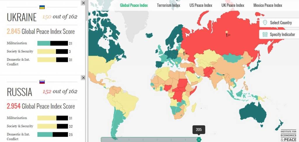 Украина заняла 150 место из 162 в рейтинге самых безопасных для жизни стран, составленном международной группой Института мира. Однако, еще в 2012 году Украина была на 84 месте.