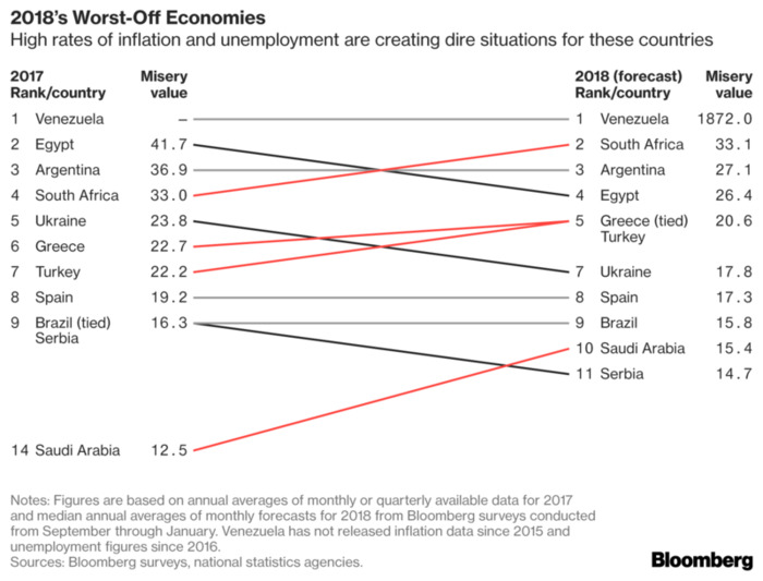 Украина улучшила свои результаты и поднялась с 5 на 7 место в рейтинге самых несчастных стран мира по версии американского агентства Bloomberg.Так, если в прошлом году индекс Украины составлял 23,8 пункта, то уже в 2018-ом он находится на уровне 17,8. Bloomberg's Misery Index рассчитывается на основе прогнозов по инфляции и безработице для 66 стран. На первом месте рейтинга уже четвертый год подряд находится Венесуэла с показателем 1872 пункта. Как отметили в Bloomberg, рост цен в этом году будет представлять более серьезную угрозу глобальной экономике, чем безработица. Наименее несчастной страной стал Таиланд. Индекс несчастья основан на давней концепции, что низкие инфляция и безработица являются индикаторами экономического благополучия людей в исследуемых странах. | |