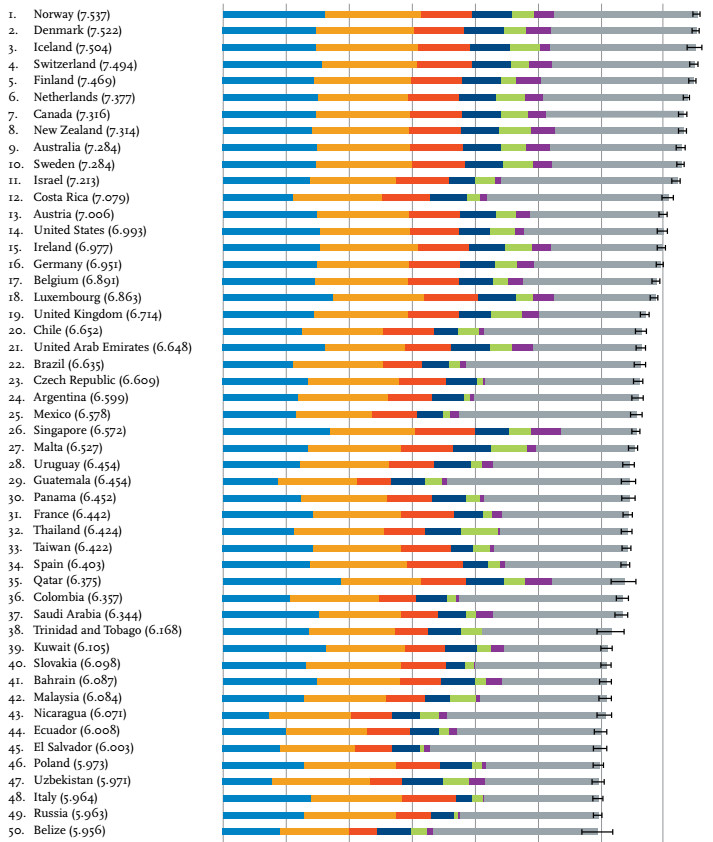 Украина заняла 132-е место из 155 в рейтинге самых счастливых стран 2017 года, опустившись на девять позиций по сравнению с прошлым годом. Об этом говорится в докладе World Happiness Report, составленном являющейся подразделением ООН Сетью для поиска решений устойчивого развития (Sustainable Development Solutions Network).Украина оказалась по соседству с Ганой (131-ое место) и Угандой (133-е место). Первая десятка рейтинга самых счастливых стран выглядит так: Норвегия, Дания, Исландия, Швейцария, Финляндия, Нидерланды, Канада, Новая Зеландия, Австралия и Швеция. Россия оказалась на 49-м месте, поднявшись на семь позиций. На последних местах Руанда, Сирия, Танзания, Бурунди и Центральноафриканская республика. Для составления рейтинга учитывались шесть основных факторов – уровень ВВП на душу населения, уровень социальной поддержки граждан, продолжительность здоровой жизни, свобода самостоятельно принимать жизненно важные решения, щедрость (сделанные пожертвования) и отношение к коррупции. В прошлом году Украина заняла 123-е место в рейтинге самых счастливых стран, также опустившись на несколько позиций по сравнению с прошлыми годами (111 место). | |