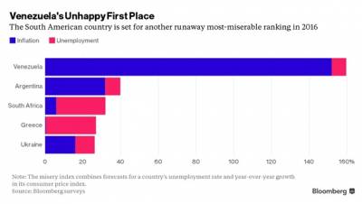 Украина опустилась в рейтинге "самых несчастных" экономик мира от агентства Bloomberg на 2016 год. Рейтинг основан на данных из 63 стран о безработице и инфляции.Согласно прогнозу Bloomberg, в 2016 году индекс несчастья Украины должен снизиться и она займет в рейтинге не второей место, как в прошлом году, а уже пятое, опередив Венесуэлу (1-е место), Аргентину (2-е), ЮАР (3-е) и Грецию (4-е). Аналитики объясняют, что экономика Венесуэлы остается самой несчастной второй год подряд из-за падения цен на нефть, которая занимает 95 процентов в экспорте страны. В десятку худших экономик также вошли Испания, Сербия, Турция, Бразилия и Казахстан. В тройку лучших экономик рейтинга с наименьшим индексом бедности вошли Таиланд, Сингапур и Швейцария. | |