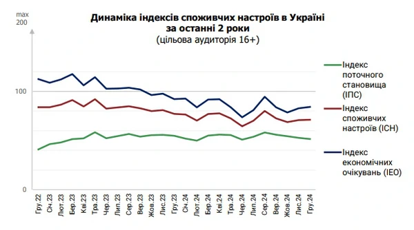 "Конец 2024 года без значительных сюрпризов и изменений в потребительских настроениях населения Украины. Как текущее положение, так и экономические ожидания населения Украины не показали значимых изменений по сравнению с ноябрем. 2024-й год характеризовался высокой волатильностью индексов, но, в общем, уровень потребительской уверенности в начале года и в конце существенно не отличаются" - комментируют аналитики Info Sapiens. Индекс потребительских настроенийИндекс потребительских настроений в Украине определяют на основании выборочного обследования домашних хозяйств страны. Во время исследования опрашивают 1000 человек в возрасте от 16 лет. Значения индексов могут меняться в пределах от 0 до 200. Значение равно 200 в том случае, если все граждане положительно оценивают экономическую ситуацию. Индекс равен 100 тогда, когда доли положительных и отрицательных оценок одинаковы. Значение индекса меньше 100 означает, что в обществе преобладают негативные оценки. Напомним, наличный курс доллара вырос за 2024 год на 11% до 42 гривен. В начале 2025 года курс повысился до 43 гривен. Инфляция за 2024 год составила 12%. Ожидается, что она начнет снижаться только во второй половине 2025 года. | |