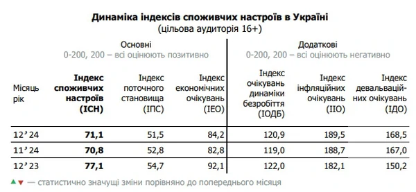 Индекс потребительских настроений украинцев в декабре 2024 года вырос на 0,4 пункта и составляет 71,1 п. Украинцы стали больше опасаться повышения цен и роста курса доллара. Об этом сообщает РБК-Украина со ссылкой на данные ежемесячного исследования компании Info Sapiens. Индекс текущего положения уменьшился и составляет 51,5 п., что на 1,2 п. ниже уровня этого показателя в ноябре. Индекс экономических ожиданий в декабре вырос на 1,4 п. и составляет 84,2 п.