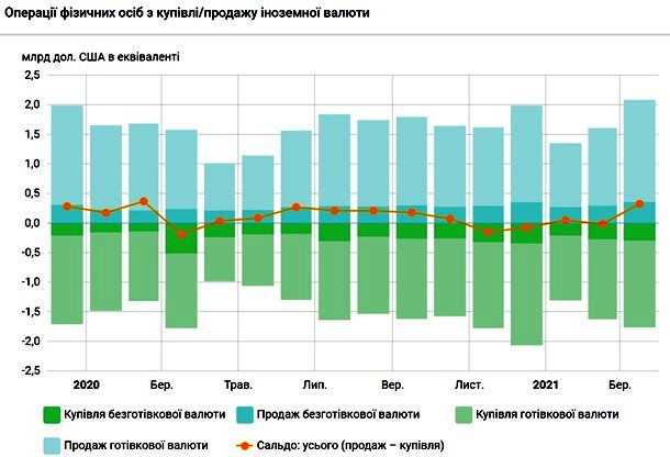 В марте украинцы продали коммерческим банкам наличной и безналичной валюты в эквиваленте на 2 082,7 млн долларов, купив на 1 753,0 млн долларов. При этом чистая продажа валюты составила 329,7 млн долларов. Об этом свидетельствуют данные на сайте Национального банка Украины (НБУ).Таким образом, в марте был зафиксирован рекордный месячный объем продажи валюты населением с начала 2020 года. Отмечается, что с начала 2021 года население продало валюты на 5 038,4 млн долларов и купило на 4 664,7 млн долларов. Чистая продажа составила 373,7 млн долларов. Согласно данным, которые учитывают безналичную валюту, за 2020 год население продало банкам валюты на 19 241,5 млн долларов и купило на 18 004,4 млн долларов. Чистая продажа составила 1 237,1 млн долларов. | |