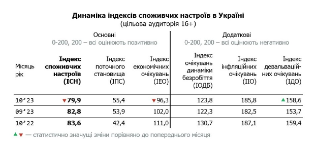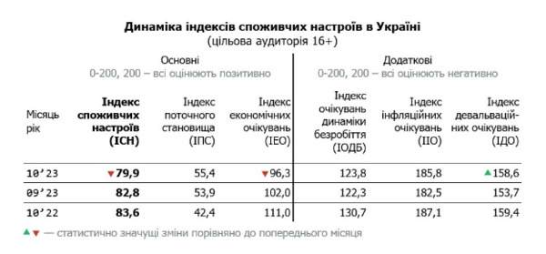В октябре 2023 года индекс потребительских настроений украинцев уменьшился на 2,8 пункта и составляет 79,9 п. Украинцы стали больше опасаться безработицы, падения гривны и роста цен. Об этом сообщает РБК-Украина с ссылкой на данные ежемесячного исследования компании Info Sapiens. В октябре показатель индекса ожидаемой динамики безработицы вырос на 1,4 п. и составляет 123,8 п. Индекс инфляционных ожиданий вырос на 3,3 п. и составляет 185,8 п. Индекс девальвационных ожиданий вырос на 4,8 п. и составляет 158,6 п.