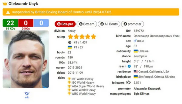Александр Усик временно отстранен от бокса. Такое решение в отношении абсолютного чемпиона мира в сверхтяжелом весе приняла Британская комиссия по боксу. По информации портала BoxRec, боксерская лицензия украинца приостановлена до 2 июля текущего года. Причины такого решения не называются, однако, вероятно, это мера пресечения в связи с повреждениями, которые Усик получил в своем последнем бою против Тайсона Фьюри.