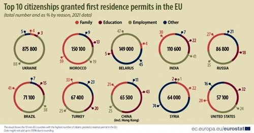 В 2021 году первые виды на жительство в странах-членах ЕС получили 875 800 украинцев – это самое большое количество среди всех получателей. Об этом, ссылаясь на данные Евростата, сообщает Европейская правда. Абсолютное большинство разрешений (83%) украинцам было выдано Польшей, причем 88% выданных Польшей документов были связаны с трудоустройством. На втором месте по количеству полученных разрешений - граждане Марокко (150 100 разрешений, из которых 50% выдано в Испании) и Беларуси (149 000, из которых 88% выдано в Польше). Граждане этих стран получили 40% всех выданных в 2021 году первых видов на жительство. Сообщается, что всего в 2021 году было выдано 2 952 300 первых видов на жительство в ЕС гражданам стран, не входящих в Евросоюз, что на 31% (или +693 700) больше, чем в 2020 году. Количество таких документов достигло допандемического уровня 2019 года. При этом Польша выдала треть всех первых видов на жительство в ЕС (967 300, или 33% от общего количества разрешений), на втором месте Испания (371 800, или 13%), на третьем - Франция (285 200, или 10%). Наибольший относительный рост общего количества выданных разрешений в 2021 году по сравнению с 2020 годом зафиксирован в Италии: +159% (со 105 700 в 2020 году до 274 100 в 2021 году), Финляндии (+132%; с 24 800 до 57 300) и Польше (+62%; с 598 000 до 967 300). Уменьшение общего количества выданных разрешений в 2021 году по сравнению с 2020 годом зафиксировано только в Германии (-41%; с 312 700 в 2020 году до 185 200 в 2021 году), Литве (-7%; с 22 500 до 21 000) и Хорватии (-4%; от 35 100 до 33 600). | |