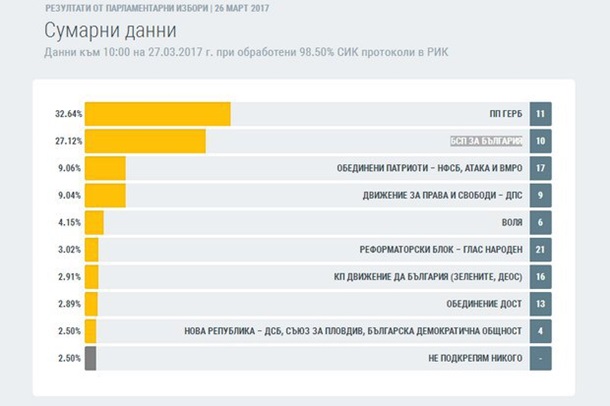 Проевропейская партия ГЕРБ (Граждане за европейское развитие Болгарии) выиграла досрочные парламентские выборы в Болгарии, состоявшиеся накануне. Об этом сегодня сообщает издание Корреспондент.Согласно данным сайта болгарского ЦИК, за эту партию проголосовали 32,64% избирателей. Лидером политсилы является бывший болгарский премьер Бойко Борисов. Таким образом, он получил мандат на формирование третьего кабинета министров. На втором месте - Болгарская социалистическая партия (лидер - Корнелия Нинова), которую называют пророссийской. Ее поддержали 27,12% избирателей. Необходимый четырехпроцентный барьер в парламент Болгарии преодолели также коалиция "Объединенные патриоты" (9,06% голосов), "Движение за права и свободы", представляющее мусульман Болгарии (9,04%), и партия "Воля" (4,15%). ![]() Победитель парламентских выборов в Болгарии (данные местного ЦИКа) | |