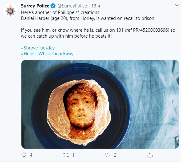 Полиция британского графства Суррей решила применить якобы необычный и весьма оригинальный метод оповещения граждан о разыскиваемых преступниках. Фотографии злоумышленников правоохранители размещают не только на стендах или в соцсетях, но и на поверхности блинов. Об этом сообщается в Twitter полицейского ведомства.В своем микроблоге стражи порядка отметили, что им удалось привлечь к сотрудничеству некоего "знаменитого кулинара Филиппа де Пэна, который помогает в розыске посредством своего искусства". Эта новость вызвала огромный интерес у большого количества пользователей. Однако британцев заинтересовал и сам повар. После многочисленных вопросов, полицейские признались, что его не существует, а портреты на блинчиках появились после обработки фотоснимков в Photoshop. Одних подписчиков такой блинный "креатив" рассмешил. А другие высказали свое недовольство, отметив, что это дискредитирует полицию и выставляет ее в неприглядном свете. "И на это тратятся в наше время деньги налогоплательщиков? Если да, то я только за. И побольше блинов!", "Вы не пробовали заниматься реальной полицейской работой вместо этого рукоделия? Показатели преступности взмыли ввысь, а вы тут балуетесь с едой", - прокомментировали запись в соцсети британские пользователи. ![]() ![]()