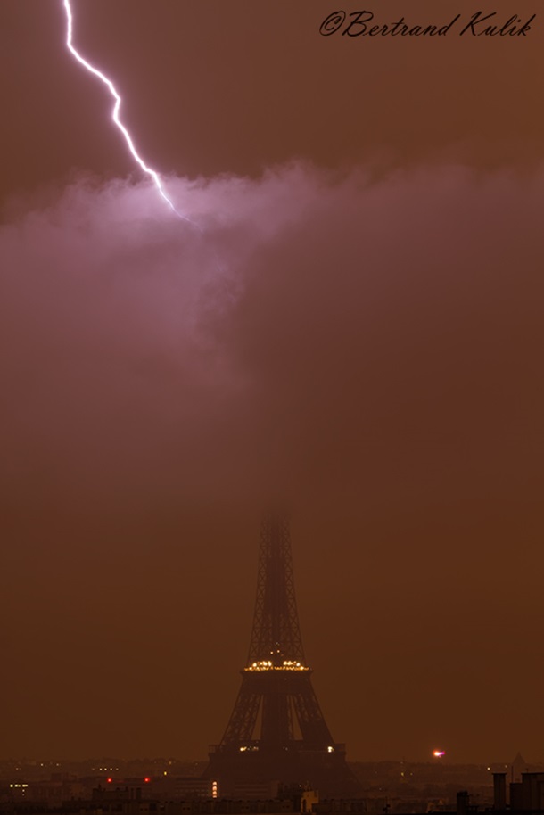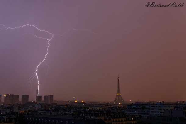 В Париже в минувшую ночь в верхушку Эйфелевой башни ударила молния. Об этом сообщает BFMTV.Сообщается, что фотограф Бертран Кулик, который часто фотографирует молнии над Парижем, снял попадание молнии в Эйфелеву башню, произошедшее около 04:30 ночи. На фотографии четко видно молнию, а верхушка башни скрыта в облаках. Также фотограф опубликовал и другие фотографии молний в небе Парижа. Издание сообщает, что в среднем в Эйфелеву башню молнии попадают 4 раза в год. ![]() ![]()