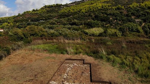 Фрагменты лаконичной крыши и мраморный перирхантерион (бассейн с водой, используемый для ритуалов) подтверждают, что здание относится к архаическому периоду. Команда также обнаружила другие архитектурные особенности, типичные для древних храмов, включая вестибюль и два внутренних помещения, одно из которых - целла, заполненная "плотным слоем плитки". | |