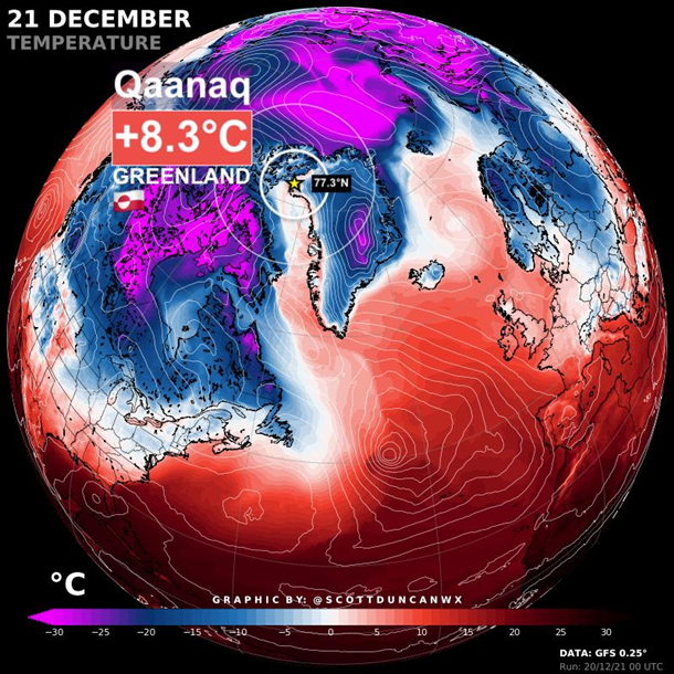 На севере Гренландии зафиксировали аномально высокую температуру. Об этом сообщил в Facebook Украинский гидрометеорологический центр сл ссылкой на метеоролога Скота Дункана.Отмечается, что в одном из самых северных городов на планете – Каанааке – 21 декабря был побит температурный рекорд. Максимальная температура в дневные часы поднялась до +8,3 градуса Цельсия. "Для таких высоких широт, учитывая холодный период года, и тот факт, что в Гренландии сейчас царит полярная ночь – это настоящая аномалия!", – подчеркнули в гидрометцентре. | |