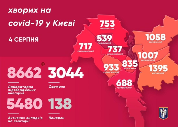 За минувшие сутки коронавирус выявили у 108 киевлян. Об этом заявил мэр столицы Виталий Кличко в Telegram во вторник, 4 августа.Таким образом на сегодня в Киеве уже 8662 подтвержденных случая COVID-19. При этом скончались уже 138 киевлян, из них трое накануне. Среди заболевших 53 женщины в возрасте от 19 до 92 лет, 46 мужчин в возрасте от 19 до 80 лет, шесть девочек от 9 до 13 лет и трое мальчиков от 1 до 15 лет. Заболели также четверо медработников. ![]() Больше всего случаев заболевания обнаружили в Дарницком районе - 21, в Днепровском - 18, в Печерском и Святошинском районе - по 13 случаев. | |