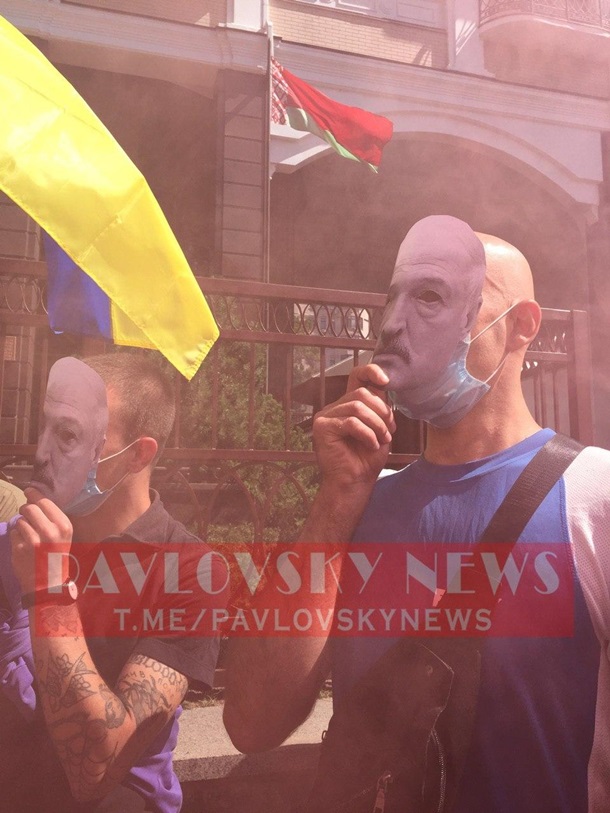 ![]() Фото: кадр из видео Возле посольства Беларуси в столице активисты провели акцию с дымовыми шашками и масками Лукашенко.