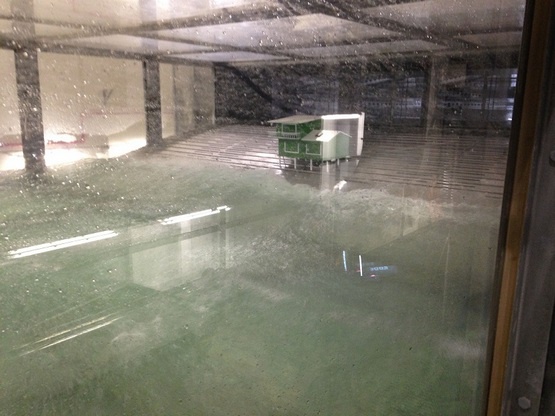 Модель небольшого дома, которая установленная на берегу искусственного «океана», поглощается волнами, которые имитируют шторм, окутавший на побережье.