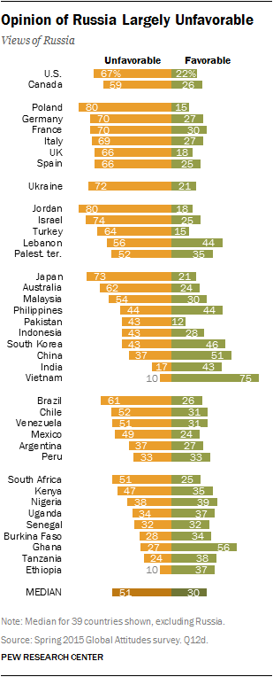В мире преобладает негативное отношение к России, а также к ее президенту. Таковы результаты исследования американской независимой социологической компании Pew Research Center, опубликованного 5 августа, пишет Лига.net.Согласно исследованию, чаще всего о России негативно высказываются жители Польши и Иордании (80% из числа опрошенных). Антироссийская позиция сильна также в Израиле (74%), Японии (73%), Германии (70%) и Франции (70%). В свою очередь, 30% опрошенных в 39 странах мира воспринимают Россию положительно. Наиболее сильна поддержка России во Вьетнаме (75%), Гане (56%) и Китае (51%). Авторы исследования отмечают, что в мире Россию воспринимают хуже, чем США. Например, в Европе о США положительно отзываются 69% жителей, а о России - 26%. В странах Африки США поддерживают 79% опрошенных, а Россию - 37%. И лишь в странах Ближнего Востока эти государства воспринимаются одинаково негативно - лишь 29% опрошенных положительно оценивают США и 25% - Россию. Имидж России сильно ухудшился также в США. Еще в 2011 году 49% американцев положительно оценивали РФ. В 2015 году положительную оценку дали лишь 22% из числа опрошенных. В свою очередь, отношение россиян к американцам ухудшилось еще заметнее. В 2013 году 51% россиян оценивали США положительно, в 2015 году этот показатель составил 15%. Читайте также: Как управлять планшетом с компьютера и наоборот? Лучшие идеи корпоративных подарков Эффективные диеты — отличный способ сбросить лишний вес PayPal стал самой дорогой в мире системой электронных платежей Владимира Путина оценивают в мире значительно хуже, чем Россию, и хуже, чем Барака Обаму. Если в России к президенту положительно относятся 88% опрошенных, то в остальных 39 странах-участницах опроса такую позицию занимают 24% жителей. Больше всего критиков российского президента в Испании (92% декларируют отсутствие доверия к Путину), Польше (87%), Франции (85%) и Украине (84%). В Польше к России положительно относятся 15%, а к Владимиру Путину - 9% участников опроса. | |