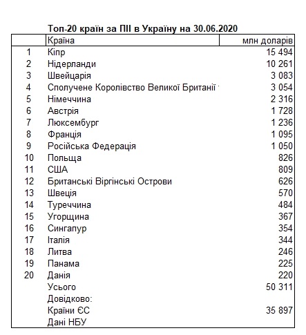 Сумма накопленных прямых иностранных инвестиций в экономику Украины по состоянию на конец первого полугодия 2020 года составляли 50,311 млрд долларов. Об этом сообщается на сайте Национального банка Украины.Отмечается, что инструменты участия в капитале составили - 38,053 млрд долларов, и еще 12,258 млрд долларов долговых инструментов. Судя по данным НБУ, крупнейшим иностранным инвестором в Украину является Кипр. Компании, зарегистрированные в этой стране, инвестировали в Украину 15,494 млрд долларов. На втором месте - Нидерланды (10,261 млрд долларов), на третьем - Швейцария (3,083 млрд долларов). Россия вложила в украинскую экономику 1,050 млрд долларов и заняла девятое месте, опередив Польшу (826 млн долларов) и США (809 млн долларов). На страны ЕС приходится две трети инвестиций (35,897 млрд долларов). ![]() | |