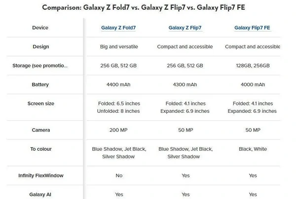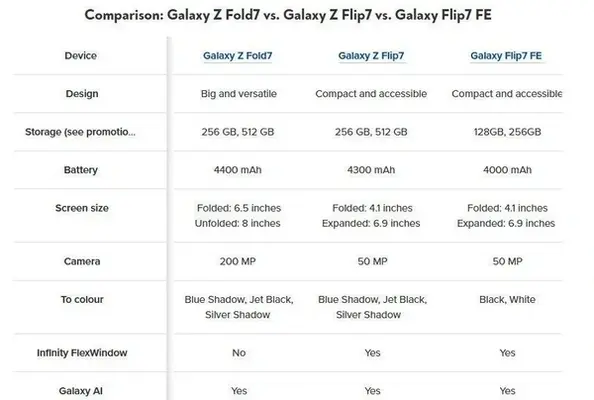 Для тех, кто ждет бюджетную версию, выйдет Galazy Z Flip 7 FE – он выйдет с теми же размерами экранов, что и Z Flip 7, но батареей 4 000 мАч и памятью, урезанной до 128 или 256 ГБ. Все три раскладушки Samsung будут оснащены стереодинамиками, боковым сканером отпечатков пальцев и новыми функциями Galaxy AI. | |