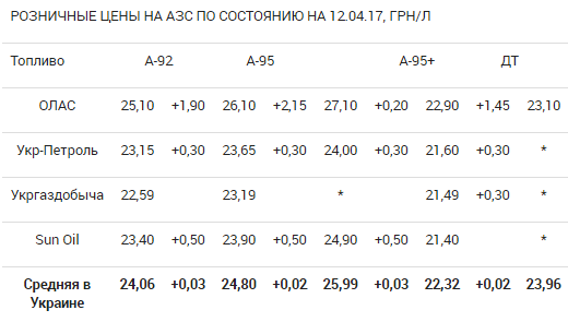 На фоне массового подорожания топлива на АЗС в течение 7-11 апреля, рост цен на бензины и дизтопливо на АЗС продолжился 12 апреля на 0,3 грн/л – 2,15 грн/л. Об этом сообщает консалтинговая компания UPECO.Так, на АЗС сети ОЛАС стоимость бензинов и ДТ выросла на 1,40-2,15 грн/т. Топливная линейка ровненского оператора подорожала до следующих значений: А-92 – 25,10 грн/д, А-95 – 26,10 грн/л, А-95 Премиум – 27,10 грн/л, ДТ – 22,90 грн/л и ДТ Премиум – 23,10 грн/л. Также, на 30 коп./л и 50 коп./л выросли на заправках Укр-Петроль и Sun Oil соответственно. Кроме того, на 30 коп./л подорожало дизельное топливо в харьковской сети Укргаздобычи. Таким образом, по состоянию на 12 апреля средняя розничная стоимость бензинов и ДТ установилась на следующих отметках: А-92 – 24,06 грн/д, А-95 – 24,80 грн/л, А-95 Премиум – 25,99 грн/л, ДТ – 22,32 грн/л и ДТ Премиум – 23,96 грн/л. ![]() | |