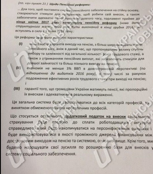 В проекте меморандума с Международным валютным фондом (МВФ) предусмотрено введение в Украине дополнительного пенсионного налога в рамках пенсионной реформы, передают Украинские новости.В документе говорится, что дополнительный налог на взносы социального страхования будет введен к уплате работодателями и будет накапливаться на персонифицированных счетах. Налог будет использоваться в качестве промежуточного источника финансирования пенсионной реформы. В качестве одной из основных характеристик пенсионной реформы в меморандуме отмечена необходимость предусмотреть новый выбор вариантов выхода на пенсию с более широким диапазоном пенсионного возраста, чем на данное время. Эти варианты будут предоставлять большую степень выбора в зависимости от трудового стажа, при этом пенсионные выплаты должны стимулировать более долгую занятость и более поздний выход на пенсию. ![]() Согласно проекту меморандума парламент должен принять пенсионную реформу до конца апреля, а вступить в силу она должна с 2018 года. | |