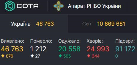 По состоянию на утро пятницы, 3 июля, в Украине зафиксировали 876 новых случаев коронавируса, что несколько меньше, чем днем ранее, когда выявили 889 новых случаев. Такие данные приводит карта Совета национальной безопасности и обороны.В то же время за минувшие сутки было резко увеличилось число смертельных случаев – их зафиксировали 27, что на 15 человек больше, чем днем ранее. Также за вчера выздоровели от вируса 505 человек, как в прошлый раз. Больше всего вчера зараженных выявили во Львовской области, Киеве, Закарпатской и Ровенской областях. Общее число заразившихся за все время пандемии в Украине достигло 46 763 человек, из них 1 212 умерли и 20 558 выздоровели. ![]() | |