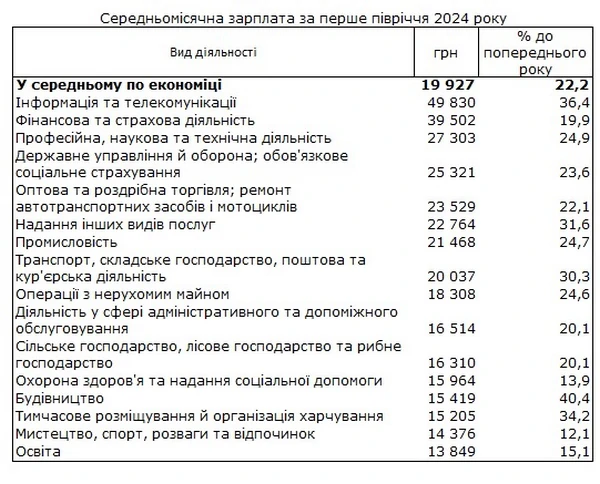 Средняя зарплата штатных работников в Украине выросла в первом полугодии 2024 на 22,2% - до 19 927 гривен. Об этом свидетельствуют данные Государственной службы статистики. Самая высокая заработная плата зафиксирована в сфере Информация и телекоммуникации, где она выросла на 36,4% - до 49 830 гривен. На втором месте - финансовая и страховая деятельность. Финансисты в среднем получают 39 502 гривны. Рост на 19,9%. Далее следует Профессиональная, научная и техническая деятельность - 27 303 гривны. Рост на 24,9%. В сфере государственного управления и обороны зарплаты выросли на 23,6% - до 25 321 гривны. Самые низкие зарплаты в образовании - 13 849 гривен, где зарплаты выросли на 15,1%. Госстат также обнародовал уточненные данные за 2023 год, согласно которым среднемесячная заработная плата штатных работников выросла на 17,7% - до 17 442 гривны. По данным Госстата, среднемесячная инфляция в 2023 году составила 12,9%. Таким образом, реальная зарплата украинцев в прошлом году выросла на 4,8%. | |