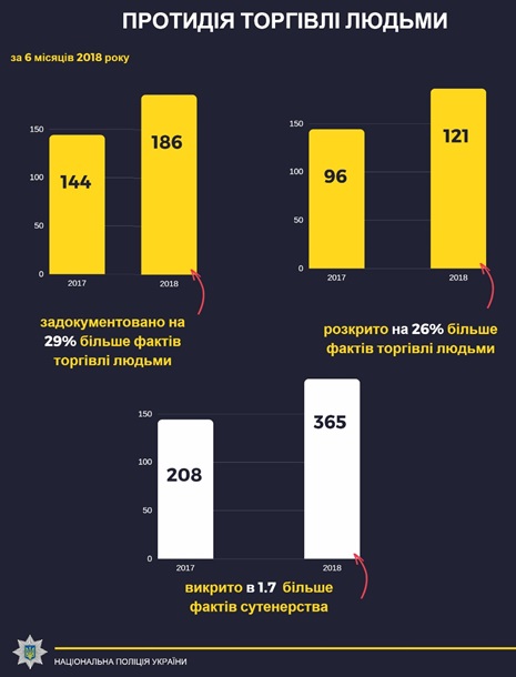 В Украине за шесть месяцев этого года число выявленных правонарушений, связанных с торговлей людьми, выросло на 29% (186 против 144 фактов в прошлом году). Об этом в субботу, 21 июля, сообщил начальник Департамента борьбы с преступлениями, связанными с торговлей людьми Нацполиции Артем Крищенко, пишет пресс-служба ведомства.Так, за шесть месяцев 2018 года Нацполиция выявила почти 190 преступлений в сфере торговли людьми. Также сообщается, что правоохранители, занимающиеся борьбой с преступлениями, связанными с торговлей людьми, разоблачили и задержали 14 членов организованных преступных групп, а также установили 63 участников этих групп. На данный момент правоохранители сообщили о подозрении в торговле людьми в 121 деле. Крищенко добавил, что уже установлено 156 лиц, которые имеют статус пострадавших в результате таких преступлений. ![]() | |