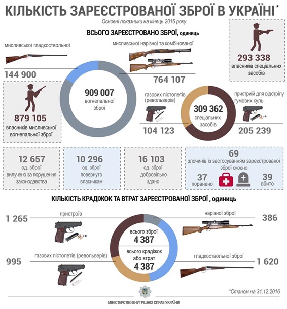 Министерство внутренних дел Украины обнародовало информацию о зарегистрированном, изъятом и украденном оружии в 2016 году. Свежую инфографику на тему оружия показал на своей странице в Facebook директор Департамента коммуникаций МВД Артем Шевченко."Свежая инфографика на тему вооружения. В 2016 году 39 граждан были убиты, 37 ранены именно зарегистрированным оружием, случаев кражи или потери оружия зафиксировано - 4387. Уважаемые владельцы легального оружия, ответственно относитесь к его хранению и применению", - написал он. Всего в Украине огнестрельным оружием владеют более 909 тыс граждан. Охотничье нарезное и комбинированное оружие имеют 764 тыс человек, а гладкоствольное оружие у 144 тыс человек, т.е. всего 909 тыс 7 человек. В 2015 году оружием владели 826 тыс 41 человек, т.е. на 9% меньше. У граждан также зарегистрировано более 104 тыс газовых пистолетов и 205 тыс устройств для отстрела резиновых пуль. ![]() В прошлом году украинские правоохранители изъяли более 12 тыс единиц оружия за нарушение законодательства, а более 16 тыс единиц оружия было добровольно сдано. | |