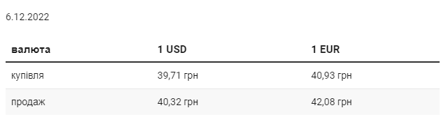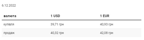 Во вторник, 6 декабря, средний курс покупки наличного доллара в украинских банках, по сравнению с понедельником, вырос на 1 коп. и составляет 39,71 грн. Курс продажи остался без изменений – 40,32 грн. Минимальный курс покупки доллара в банках составляет – 38,8 грн, максимальный – 40 грн. Для продажи минимальный курс – 39,9 грн, максимальный – 40,7 грн. Средний курс покупки евро вырос на 7 коп. и достиг 40,93 грн. Средний курс продаж увеличился на 5 коп. и составляет 42,08 грн. Минимальный курс покупки для евро составляет – 39,7 грн, максимальный – 41,5 грн. Для продажи минимальный курс – также 41,5 грн, максимальный – 43 грн. | |