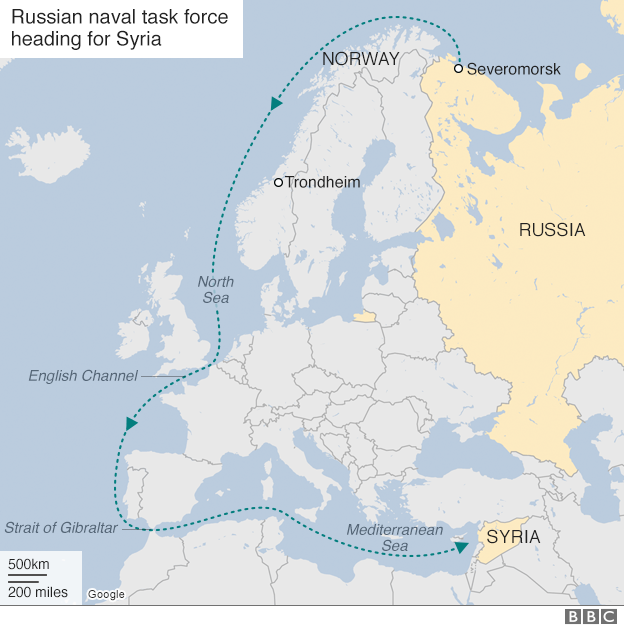 Вооруженные силы Норвегии зафиксировали у своих берегов восемь российских судов, направляющихся в Сирию.Об этом сообщает ВВС со ссылкой на заявление ВС Норвегии. Флотилия РФ отправилась в Сирию из порта в Североморске, в ее состав входит единственный российский авианосец Адмирал Кузнецов. Российский флот прошел в районе норвежского города Тронхейм (в нескольких сотнях миль к западу). ВС Норвегии также опубликовали фотографии российского Адмирала Кузнецова и сопровождающих его кораблей. ![]() ![]() Напомним, министр обороны России Сергей Шойгу, 18 октября, заявил, что российская авиация досрочно прекратит бомбардировки Алеппо для введения 20 октября гуманитарной паузы. | |