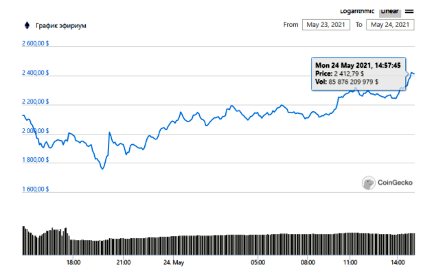 Вторая крупнейшая (по капитализации) криптовалюта в мире Ethereum за 24 часа выросла в цене до $2260. Стоимость Ethereum на криптобирже Binance за прошедшие сутки увеличилась почти на 30%. Об этом свидетельствуют данные CoinGecko.Капитализация цифровой монеты составляет $262 млрд. 23 мая, цена альткоина опускалась до $1700 впервые с марта 2021 года. За прошедшие две недели цифровая монета подешевела на 42%. По состоянию на 14:57 по Киеву стоимость Ethereum составляла $2412,79. С начала 2020 года цена Ethereum выросла на 490%, а сначала апреля 2021 года – на 89%, достигнув капитализации в $469 млрд. | |