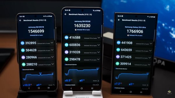 YouTube-блогер NL Tech сравнил в бенчмарках новую флагманскую серию смартфонов Samsung Galaxy S24. В его распоряжении оказались Galaxy S24, Galaxy S24+ с процессором Exynos 2 400 и Galaxy S24 Ultra на Snapdragon 8 Gen 3 for Galaxy. Об этом пишет РБК-Украина со ссылкой на YouTube-канал NL Tech. Для точности блогер установил на всех трех смартфонах одинаковые настройки, зарядил каждый до 100 процентов, и установил яркость экрана на 1000 нит, чтобы провести сравнение в одинаковых условиях. Единственные различия заключаются в размерах и процессорах, за исключением того, что у базовой модели Galaxy S24 также ниже разрешение экрана, чем у двух других - 2340x1080 против 3120x1440. Тест GeekbenchВ одноядерных и многоядерных тестах Geekbench 6 лучший результат показал Galaxy S24 Ultra, имея примерно на 5-7 процентов больше баллов по сравнению с двумя другими моделями. Однако графический тест этого бенчмарка показал, что Exynos 2 400 немного превосходит Snapdragon 8 Gen 3 for Galaxy. Интересно, что в AnTuTu Galaxy S24 Ultra набрал больше баллов в каждой категории, включая GPU. Solar BayStress TestВ графическом стресс-тесте 3DMark Solar Bay Exynos 2 400 проявил заметное превосходство над Snapdragon 8 Gen 3 for Galaxy, но в 3DMark Wild Life Extreme ситуация ровно обратная в пользу чипа Qualcomm. При этом процессор Samsung продемонстрировал лучшую стабильность в обоих стресс-тестах. Тест на автономностьВ завершении блогер провел тест на автономность, результаты которого оказались весьма неожиданными. Например, для Galaxy S24 с аккумулятором емкостью 4 000 мА/ч бенчмарк показал 13 часов 50 минут работы, в то время как Galaxy S24+ с батареей на 4 900 мА/ч продержался 13 часов 22 минуты. Лучший результат показал Galaxy S24 Ultra, работающий 15 часов. Однако важно помнить, что результаты бенчмарков не всегда отражают реальные сценарии использования. | |