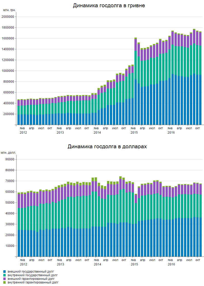 Общая сумма государственного и гарантированного государством долга Украины на конец декабря 2016 года составила 70,97 млрд долларов, что на 8,3%, или на 5,47 млрд долларов, больше показателя на начало года.В гривневом эквиваленте общая сумма государственного и гарантированного государством долга на конец декабря составила 1,930 трлн грн, что на 22,7%, или на 357,58 млрд грн, больше показателя на начало года. Показатель госдолга соответствует пределам, установленным в государственном бюджете Украины на конец 2016 года на уровне 1,946 трлн грн. С учетом оценок номинального ВВП Украины за 2016 год, обнародованных Национальным банком Украины, на уровне 2,358 трлн грн, показатель госдолга на конец года составил 81,8% ВВП. Согласно данным Минфина, в декабре сумма государственного и гарантированного государством долга в долларовом эквиваленте выросла на 5,1%, или на 3,43 млрд долларов, в гривневом эквиваленте – на 11,6%, или на 200,84 млрд грн. Ранее эксперты прогнозировали, что показатель госдолга Украины по итогам года достигнет уровня 82% ВВП, при этом треть годового прироста, по их оценкам, обусловлена национализацией крупнейшего банка ПриватБанк, для докапитализации которого правительство выпустило облигации внутреннего госзайма на 107 млрд грн. Напомним, государственный и гарантированный государством долг в 2015 году в долларовом эквиваленте снизился на 6,2% – до 65,488 млрд доларов, или до 1,572 трлн в гривневом эквиваленте, что составило около 80% ВВП. ![]() | |