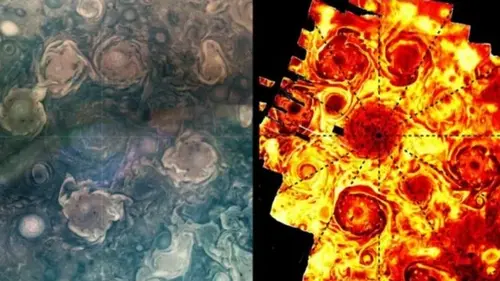 ![]() Фото: NASA Ученые считают, что они нашли решение давней загадки, которая касается полярных атмосферных штормов на двух самых больших планетах Солнечной системы