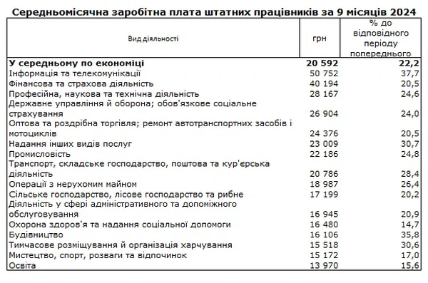 Средняя зарплата штатных работников в Украине выросла за январь-сентябрь 2024 на 22,2% до 20 592 гривен. Финансистами и айтишникам платят гораздо больше. Об этом сообщает РБК-Украина со ссылкой на Государственную службу статистики (Госстат). По данным статистического ведомства, самая высокая заработная плата в сфере "Информация и телекоммуникации", где она выросла на 37,7% до 50 752 гривен. На втором месте – "Финансовая и страховая деятельность". Финансисты в среднем получают 40194 гривен. Рост на 20,5%. Далее следует "Профессиональная, научная и техническая деятельность" – 28 167 гривен. Рост на 24,6%. В сфере "Государственное управление и оборона" зарплаты выросли на 24% до 26 904 гривен. Самые низкие зарплаты в образовании – 13 970 гривен, где зарплаты выросли на 15,6%.