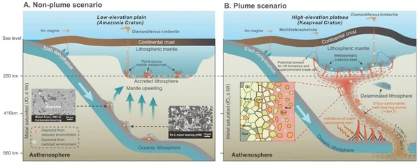 В новом исследовании ученые обнаружили, что глубинные перемещения углерода в недрах планеты могут вызвать значительные изменения в окислительно-восстановительных состояниях мантии Земли. Этот процесс важен для формирования континента и алмазов. Об этом говорится в исследовании, опубликованном в журнале Science Advances, пишет PHYS.org. В новом исследовании ученые из Института геохимии Гуанчжоу Китайской академии наук совместно с международными коллегами обнаружили, что глубоко субдуцированные карбонаты могут вызывать значительные изменения в окислительно-восстановительных состояниях мантии Земли. Наиболее любопытно то, что именно этот процесс влияет на образование подлитосферных алмазов и играет важную роль в долгосрочной эволюции кратонов — древних стабильных частей континентальной литосферы. Модель недр ЗемлиКоманда провела эксперименты под высоким давлением, смоделировав глубины от 250 до 660 километров. Это позволило изучить, как расплавы карбонатита, полученные из субдуцированных плит, взаимодействуют с металлическими железосодержащими мантийными породами. Результаты указывают на то, что в более прохладных условиях мантии расплавы карбонатита подвергаются постепенному восстановлению — это приводит к образованию неподвижных алмазов, помогающих стабилизировать кратон. В то же время в более горячих условиях, под влиянием плюма, расплавы карбонатита имеют тенденцию окислять окружающую мантию — это ослабляет литосферу и может вызвать ряд реакций, а именно: