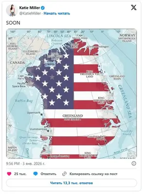 Кэти Миллер, жена советника американского лидера Дональда Трампа по внутренней безопасности Стивена Миллера, опубликовала карту, на которой остров Гренландия окрашен в цвета флага Соединённых Штатов Америки. Соответствующий пост она опубликовала в соцсети X. К изображению женщина добавила короткую подпись: "Скоро". На ее пост отреагировал посол Дании в США Йеспер Меллер Серенсен: "Просто дружеское напоминание о США и Королевстве Дания: мы являемся близкими союзниками и должны продолжать сотрудничать как таковые. Безопасность США является также безопасностью Гренландии и Дании. Гренландия уже является членом НАТО. Королевство Дания и Соединенные Штаты сотрудничают для обеспечения безопасности в Арктике. Королевство Дания значительно усилило свои усилия по безопасности в Арктике — только в 2025 году мы выделили 13,7 млрд долларов США, которые могут быть использованы в Арктике и Северной Атлантике. Потому что мы серьёзно относимся к нашей общей безопасности. И да, мы ожидаем полного уважения к территориальной целостности Королевства Дания". | |
