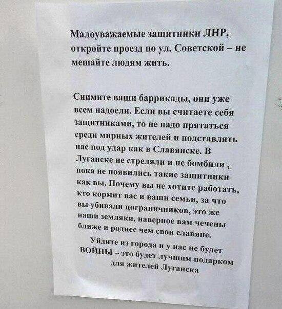 Блогер Gottfried Lenz показал, какие неожиданные объявление-открытки для террористов появились в оккупированном Луганске.В тексте-обращении говорится следующее: «Малоуважаемые защитники ЛНР, откройте проезд по вул. Советской – не мешайте людям жить. Снимите ваши баррикады, они уже всем надоели. Если вы считаете себя защитниками, то не надо прятаться среди мирных жителей и подставлять нас под удар как в Славянске. В Луганске не стреляли и не бомбили, пока не появились такие защитники как вы. Почему вы не хотите работать, кто кормит вас и ваши семьи, за что вы убивали пограничников, это же наши земляки, наверняка вам чеченцы ближе и роднее, чем свои славяне. Уйдите из города и у нас не будет ВОЙНЫ – это будет лучшим подарком для жителей Луганска». | |